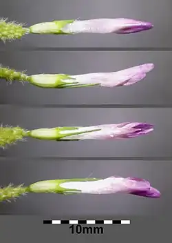 Die zwittrigen Blüten sind zygomorph und fünfzählig mit doppelter Blütenhülle. Die fünf Kelchblätter sind verwachsen. Die zehnnervige Kelchröhre ist nur wenig behaart. Die ungleichen Kelchzähne sind gewimpert. Einzelne der fünf roten Kronblätter sind verwachsen. Die Krone besitzt die typische Form einer Schmetterlingsblüte und ist 10 bis 18 Millimeter lang. Das einzelne Fruchtblatt ist oberständig.