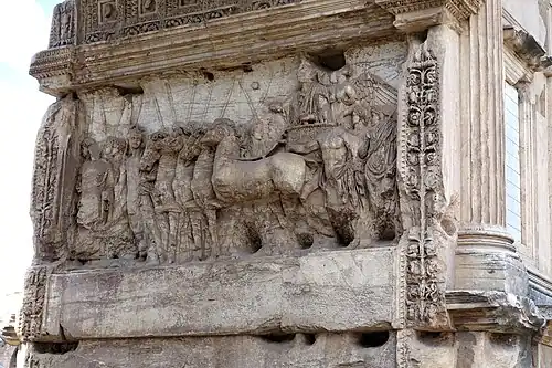 - ↑ Gerhard Koeppel: Die historischen Reliefs der römischen Kaiserzeit VI: Reliefs von bekannten Bauten der augusteischen bis antoninischen Zeit, 1989, S. 50 f.; Michael Pfanner: Der Titusbogen, Mainz 1983, S. 48.