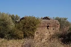 Folgt man der südlichen Straße, so erreicht man nach etwa 150 m eine Spitzkehre. Etwa 60 m westlich des Weges ist noch ein Stück der Stadtmauer und ein Turm von 7,80 × 7,80 m erhalten. Unterhalb dieses Turmes bei der Agia Irini Kapelle fand Legrand zahlreiche einfache Tonlampen, mehr als 500 protokorinthische Skyphoi und einige Tonfiguren. Man vermutet, dass hier der Tempel der Demeter Thesmophoros lag. Unterhalb welchem ein Tempel des Poseidon Phytalmios gestanden haben soll.[25] Etwas südlich der Agia Irini Kapelle gibt es Überreste mehrerer Horizontalrad-Wassermühlen.