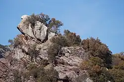 Kehrt man von der Agios Georgios Kapelle zurück zur Straße, so erreicht man etwa 100 m westlich eine Weggabelung. Hier liegt der sogenannte Theseus-Stein, unter dem sein Vater das Schwert und die Sandalen versteckt haben soll. Gegenüber fand man die Überreste des ardalischen Museions, das von Ardalos, dem Sohn des Hephaistos, erbaut sein soll. Hier soll Pittheus die Redekunst gelehrt haben.[24] Bei den massiven Mauern und Bögen aus Ziegelsteinen handelt es sich um die Überreste einer römischen Therme. In dem Hain bei der Therme fand man mehrere Inschriften. Darunter befand sich auch ein Sockel einer Statue aus der Hand von Kephisodotos dem Jüngeren, die Apollon geweiht war.