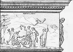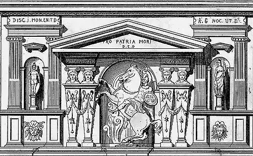 Ein Architrav stützt sich auf die beiden Füße. Das Thema ist der Brand von Troja. Drei Figuren in Hochrelief gliedern ein Flachrelief. In der Mitte Jupiter mit Schwert und Blitzen zwischen seinen Füßen der Adler, rechts Merkur, links Venus. Das Flachrelief zeigt auf der linken Seite die Darstellung einer eroberten Stadt, die Bewohner flüchten in Kähnen, sie werden verfolgt von den Siegern auf Rossen. Im Hintergrund im Flachrelief Reiter über eine Brücke herziehend. Auf der rechten Seite wird der Brand Trojas dargestellt, im Vordergrund sind zusammenstürzende und flüchtende Frauen dargestellt, rechts Gruppen aus dem Raffaelschen Brand des Borgo. An den Schmalseiten rechts Pyramus und Thisbe am Brunnen, links Urteil des Paris.[1]