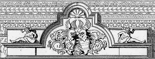 Die Krönung des Aufsatzes bildet das Doppelwappen der von der Horst, und der von Palandt und der Zahl 1577. Es befindet sich zwischen den sitzenden Gestalten zweier gefesselter nackter Menschen.