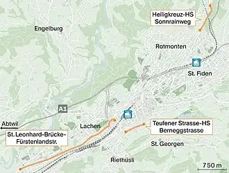 | 3 | Abtwil St. Josefen – Bahnhof – Heiligkreuz | 36 / 36 Minuten | 15 Minuten | 6 Kurse | |
