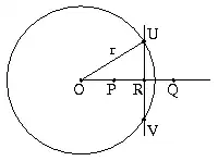 Der Punkt R liegt, anders als in der Skizze, außerhalb des Kreises, weswegen es den Schnittpunkt U nicht gibt. Denn aus Gleichung 5.) r² = OR² - PR² folgt OR² = r² + PR² > r². Der entscheidende Fehler wird also im vierten Schritt gemacht, wo ein Schnittpunkt U unterstellt wird, den es nicht geben kann.