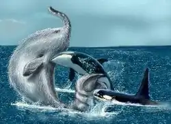 Künstlerische Darstellung des Trunko wie er von zwei Orcas angegriffen wird; gezeichnet von Bill Asmussen