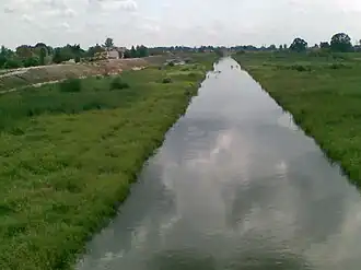 ![]() Die Trześniówka an der Grenze der Stadt Sandomierz, links Dammbau nach der Überschwemmung 2010 | ||