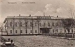 Das Gymnasium wurde in der frühen Mitte des 19. Jahrhunderts von dem Italiener Francesco Boffo im klassizistischen Stil erbaut. Der Schüler Anton Tschechow besuchte das Gymnasium von 1868 bis 1879. Der immerhin fast zwölf Jahre lange Schulbesuch lieferte Stoff für die Briefe und Telegramme[2] sowie die Erzählungen Der Repetitor[3], Der Literaturlehrer, Ariadna und Der Mann im Futteral. A. F. Djakonow[4], seinerzeit Inspektor am oben rechts abgebildeten Gymnasium, soll Vorbild für die Figur des Mannes im Futteral gewesen sein.