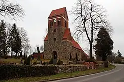 Im Teilort Tuchen gab es ursprünglich ebenfalls eine Feldsteinkirche aus dem 13. Jahrhundert, diese wurde jedoch im Dreißigjährigen Krieg schwer beschädigt. Anfang des 18. Jahrhunderts erhielt das Dorf Tuchen vom Königreich Preußen finanzielle Unterstützung zum Wiederaufbau der Kirche, mit dem im Jahr 1711 begonnen wurde, 1718 war die Kirche fertig gestellt. Die heutige Dorfkirche Tuchen ist ein Fachwerkbau mit polygonalem Ostschluss und quadratischem Dachturm.[7] 1856 erfolgten erste Instandsetzungsarbeiten an der Kirche, jedoch verfiel das Gebäude im Verlauf der Zeit so sehr, dass es 1973 geschlossen werden musste. Im Herbst 1990 stürzte das Kirchenschiff nach einem Windstoß zusammen. Die Kirchenruine wurde daraufhin abgerissen und ab 1991 in dreijähriger Bauzeit rekonstruiert. Am 14. Januar 1994 wurde die Dorfkirche neu eingeweiht.[8]
