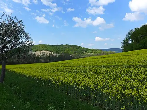 Blick über ein Rapsfeld zum Tuchtberg mit dem Steinbruch im NSG | ||