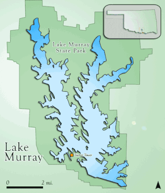 Der Lake Murray ist ein von Menschenhand geschaffener Stausee, der durch den Bau eines Damms[10] im Gebiet des Anadarche und des Fourche Maline Creek entstand. Er wurde in erster Linie für Erholungszwecke angelegt. Der See hat eine Fläche von 23,18& km², eine Uferlinie von 67 Meilen (ca. 108 km) und ein Fassungsvermögen von 153.250 Acre-Feet (189,36 hm³).[12] Der Baubeginn des Damms war 1935, die Fertigstellung 1937 fertiggestellt.[12][5] Die ursprünglichen Pläne für den Damm wurden von Ingenieuren des Oklahoma Agricultural & Mechanical College, der heutigen Oklahoma State University (OSU), entwickelt.[5] Der Damm ist ein Erddamm mit einem durch Erde und Felsen bedeckten Betonkern.[13] Das Bauwerk wurde am 5. März 1938 an den Staat übergeben.[5]