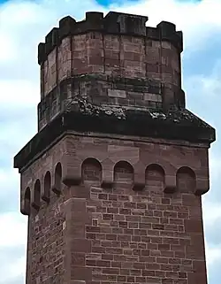 Das historische Tunnelbelüftungsgebäude am Königstuhl erhebt sich inmitten des Heidelberger Stadtwalds, am Johannes-Hoops-Weg 8. Das an eine spätmittelalterliche Festung erinnernde technische Gebäude mit seiner außergewöhnlichen Turmarchitektur wurde als obertägiges Maschinenhaus im Rahmen der Erbauung des Königstuhltunnels (1909/1912) im Jahr 1914 in Betrieb genommen. Anfänglich lief durch den Tunnel nur Güterverkehr.[1] Der Personenverkehr erfolgte über die benachbarte Odenwaldbahn.