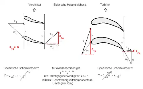 ist hier die spezifische Schaufelarbeit, die Umfangsgeschwindigkeit der sich drehenden Schaufelspitze am Eintritt (Index 1) und Austritt (Index 2), desgleichen die nutzbare Fluidgeschwindigkeit am Ein- und Austritt.