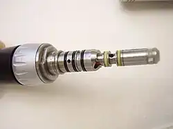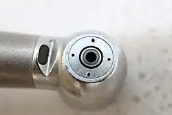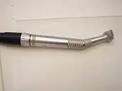 Während bei einem elektrischen Mikromotor die Kraft über eine Welle in den Arbeitskopf übertragen wird, wird bei einer Turbine die Rotation des Bohr- bzw. Schleifwerkzeugs durch einen Luftstrom im Kopf des Winkelstücks erzeugt. Das Werkzeug ist dazu mit einem Turbinenrad mit etwa 6 bis 8 Turbinenschaufeln versehen. Je nach Modell beträgt der Treibluftdruck zwischen 2,3 und 2,7 Bar. Die Treibluft wird anschließend zurückgeführt, weil sie beim Entweichen in die Mundhöhle die Behandlung stören würde. Turbinenköpfe haben in aller Regel eine Passung für rotierende zahnärztliche Instrumente mit FG-Schaft. Als rotierende Instrumente werden vor allem Diamanten eingespannt, manchmal auch Hartmetallbohrer, um beispielsweise Kronen oder Brücken durchzutrennen. Heute kommen größtenteils luftdruckgetriebene Turbinen zum Einsatz.[3]