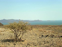 Der Turkana-See (auch noch unter seinem früheren Namen Rudolfsee bekannt) ist mit 6405 km² das größte Binnengewässer Kenias sowie einer der größten „Endseen“ der Erde, wobei der nördlichste Teil mit 22,7 km² zu Äthiopien gehört. Der Turkanasee versalzt immer mehr und sein Wasserspiegel sank bis zum Jahr 2010 ab, da der See mit Omo, Turkwel und Kerio zwar Zuflüsse hat, aber durch Verdunstung mehr Wasser verliert und sich die Mineralsalze anreichern („Versalzung“). Seit 2010 hat sich der See um etwa zehn Prozent ausgedehnt[2][3] und dabei rund 800 Quadratkilometer Land überflutet[4].