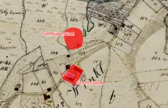 Lageplan des Turmhügels Winkl und von Schloss Winkl (Oberbayern) auf dem Urkataster von Bayern | ||