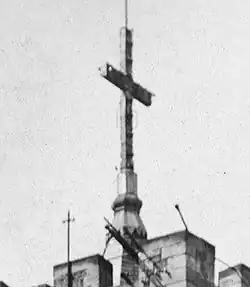 Man benötigte sowohl finanzielle Mittel für die Beschaffung der erforderlichen Baumaterialien als auch politische Unterstützung (aus Furcht vor stalinistischen Repressionen). Der Eisenacher Kunstschlosser Gustav Laufer konnte noch im Juli 1946 das aus Teilen des 1944 zerstörten Originals neu aufgebaute Turmkreuz auf dem Turm montieren.[9] Beim Lutherfest am 10. November 1946 wurde auch die Wiedererrichtung des Turmkreuzes auf der Wartburg gewürdigt. In der Presse wurde damals irrtümlich berichtet, dass ein neu angefertigtes Kreuz auf dem Turm aufgebaut worden sei.[6]