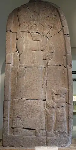 Eine Siegessäule aus Samʼal, die zeigt, wie Asarhaddon zwei winzige Bittsteller, die offenbar Ba’al I. und Taharqa darstellen, an Nasenringen führt. (Pergamonmuseum, Berlin)