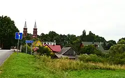 Katholische Dreifaltigkeitskirche Užpaliai mit separatem Glockenturm, erbaut 1898