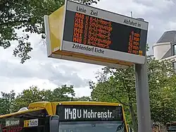 Ein Tag nach der Umbenennung: Die Fahrtzielanzeige am Bus zeigt noch den alten, die Anzeigetafel an der Haltestelle bereits den neuen Namen des U-Bahnhofs