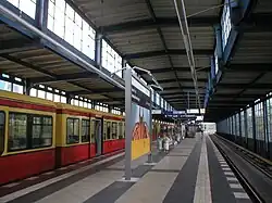 Bahnsteig des S-Bahnhofs, links ein Zug der Baureihe 481/482