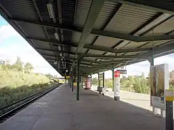 Die Station besitzt, wie die anderen Bahnhöfe dieses Streckenteils, einen überdachten Mittelbahnsteig und liegt auf Geländeniveau. Die Kennfarbe des Bahnhofs ist Grün.