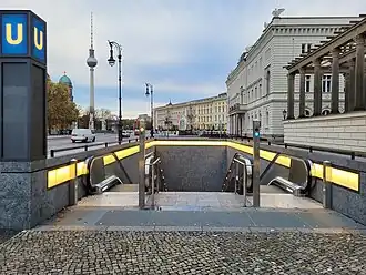 Die Station mit Mittelbahnsteig befindet sich am östlichen Ende des Boulevards Unter den Linden, zwischen dem Zeughaus und dem Berliner Schloss. Ein Teil des Bahnhofs befindet sich unmittelbar südlich der Schloßbrücke unter dem Spreekanal. Der Bahnsteig liegt in rund 16 Metern Tiefe unter der Straßenoberkante.[4] Der Planungsname lautete U-Bahnhof Schlossplatz.[5]