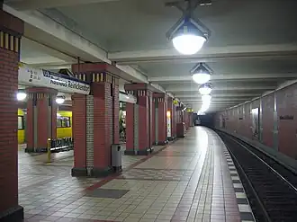 Der Mittelbahnsteig des Bahnhofs hat Ausgänge an beiden Bahnsteigenden, die jeweils in Vorhallen führen. Der südliche Ausgang ist eine Besonderheit: Er verfügt über eine oberirdische Vorhalle, die sich brückenartig über dem Nordgraben befindet. Rote Klinker zieren die Wände in der Bahnsteighalle, Natursteinblöcke lockern sie auf. Die Mittelstützen sind rot, weiß und schwarz sowie im Kapitell gelb. Wie auch die anderen 1994 eröffneten Bahnhöfe der Linie U8 wurde diese Station nach einem Entwurf von Rainer G. Rümmler errichtet.