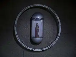 Zur sakralen Atmosphäre des Bahnhofs passt, dass die Station mit einer Heiligenfigur geschmückt ist, was im traditionell protestantischen Frankfurt ein humorvolles Unikum darstellt. Hinter dem nordwärts führenden Gleis steht unter einem Glassturz eine Figur der Heiligen Barbara, der Schutzpatronin der Bergleute und in deren Nachfolge auch der Tunnelbauer. Hierfür war der Architekt Willy Orth verantwortlich, der auch die Station Kirchplatz auf der C-Strecke mit ihren sakralen Blendarkaden entwarf. Auf einem Kranz stehen die Namen der sechs Patinnen der Tunnelröhren rund um die Station: „Roselinde“ und „Frolinde“ für die beiden Röhren der Mainunterfahrung (nach der Frau des Oberbürgermeisters Arndt sowie der damaligen Stadtverordnetenvorsteherin Balser), sowie „Sybille“ (Babendererde), „Margarethe“ (Weber), „Uschi“ (Prugel) und „Liesel“ (nach der Schauspielerin Liesel Christ) für die vier Tunnelstücke nördlich und südlich der Station.[2][4]