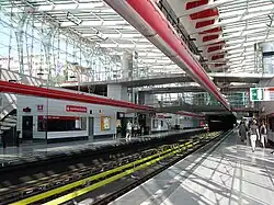 Die beiden Seitenbahnsteige sind durch drei Übergänge verbunden. Über vier Aufzüge ist der Bahnsteig barrierefrei zugänglich.[1] Es bestehen Umsteigemöglichkeiten zu städtischen Autobuslinien.