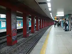 Die Station wurde bis 2025 umfassend erneuert: In der B-Ebene wird mit blauen und roten Wänden, mit Fotos der Ensembles und den Logos der Städtischen Bühnen die Corporate Identity von Schauspiel und Oper aufgegriffen.[5] Die C-Ebene wurde in der schwarz-roten Farbgebung von Eintracht Frankfurt gestaltet; Sitzschalen aus dem Waldstadion und Wandbilder zur Geschichte des Vereins erinnern an einen Stadionbesuch.[6] Diese Ausgestaltung ergänzt die bereits 2013 geschaffenen „Säulen der Eintracht“ zwischen den Gleisen: Elf Spieler und ein Trainer von Eintracht Frankfurt, die per Internet-Abstimmung ausgewählt wurden,[7] werden seit Januar 2013 auf den zwölf tragenden Säulen gewürdigt. Dies sind Oka Nikolov, Uwe Bindewald, Bruno Pezzey, Charly Körbel, Jay-Jay Okocha, Uwe Bein, Jürgen Grabowski, Alexander Schur, Bum-kun Cha, Anthony Yeboah, Bernd Hölzenbein und als Trainer Jörg Berger.[8]