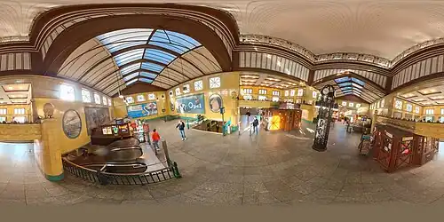 Zur Umgestaltung von 1913 gehörte auch ein neues Zugangsbauwerk. In der Mitte der Bahnsteige wurden Treppen angeordnet, die in eine darüberliegende Eingangshalle münden. Diese wurde, passend zum in der Nähe befindlichen KaDeWe, sehr repräsentativ erbaut und präsentierte sich als mächtiges kreuzförmiges Hallengebäude, das den Wittenbergplatz völlig beherrscht. Nach ihrer Zerstörung im Zweiten Weltkrieg wurde die Eingangshalle bis 1951 wieder aufgebaut.[3] Danach wurde sie durch Modernisierungsmaßnahmen weiter verändert und es dominierten vor allem Werbeflächen den Innenraum. In den Jahren 1982 und 1983 erfolgte daraufhin eine aufwendige denkmalgerechte Restaurierung. Die bis heute bestehenden Wandmalereien mit Motiven nach historischen Reklame-Vorlagen wurden bei dem Ost-Berliner Künstler Lutz Brandt in Auftrag gegeben.[4][5]