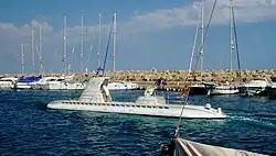 Touristen-U-Boot Nemo beim Einlaufen in den Hafen von Portals Nous auf der Baleareninsel Mallorca