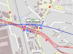 Der Bahnhof wird von der Linie U1 bedient. An der Oberfläche befinden sich die beiden Bushaltestellen Klinikum West und Klinikum Ost, an denen die Stadtbuslinien 171, 172, und 175 sowie die OVF-Linien 125 und 126 halten. Das etwa 500 m entfernte Klinikum Fürth ist aber besser erreichbar über die Haltestelle Jakob-Henle-Straße/Klinikum (Linien 171 und 175). Am Wochenende verkehrt auch die Nachtbuslinie N9.