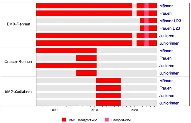 Seit 1996 gibt es Rennen in den Kategorien Elite und Junioren, jeweils bei Männern und Frauen. Hauptereignis ist seit jeher das BMX-Rennen der 20-Zoll-Klasse, zusätzlich wurden bis 2010 auch Weltmeister in der Radklasse Cruiser ermittelt. Von 2011 bis 2016 standen Wettbewerbe im BMX-Zeitfahren auf dem Programm, seitdem gibt es nur noch das BMX-Rennen. 2022 kamen Rennen für Männer U23 und Frauen U23 hinzu. Im Rahmen der Weltmeisterschaften wird jeweils die UCI BMX Racing World Challenge ausgerichtet für die Leistungsklassen Challenge und Masters, mit zahlreichen Rennen für Kinder und Jugendliche. Diese haben jedoch nicht denselben Status.