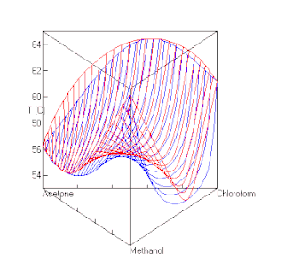 berechnet mit UNIFAC bei P=1 atm. Die roten Linien sind Dampfzusammensetzungen, die blauen die Zusammensetzung der Flüssigkeit.