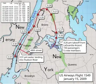 Etwa sechs Minuten nach dem Abheben setzte das Flugzeug in südlicher Richtung auf dem Hudson River etwa zwischen der 48. Straße in Manhattan und Port Imperial in Weehawken, New Jersey auf.[10][11] Diese Notwasserung gilt als Meisterleistung des Kapitäns, da die unter den Tragflächen hängenden Triebwerke beim Eintauchen ins Wasser meist asymmetrisch abreißen und der enorme gleichfalls asymmetrische Widerstand das Flugzeug aus der Bahn reißt, wodurch dieses meist zerbricht. In diesem Fall riss zwar auch eines der Triebwerke ab, es gelang dem Kapitän aber dennoch, die Maschine auf Kurs zu halten und so ein Auseinanderbrechen zu vermeiden.