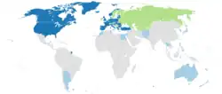 Verbündete der USA (Stand 2007) in drei Abstufungen Dunkelblau: NATO, Hellblau: sogenannte major-non-NATO-allies; wichtigste Verbündete außerhalb der NATO; Hellgrün: Mitglieder der Partnerschaft für den Frieden