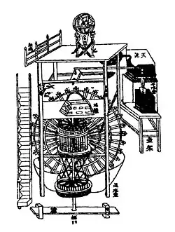 Das zu seiner Zeit komplizierteste Zeitmessinstrument und ein in seiner Größe vermutlich beeindruckender Uhrturm war die astronomische Uhr, die der chinesische Erfinder Su Song um 1090 in Kaifeng entwickelte. Mittels eines Wasserrades wurde eine aufwendige Mechanik, die eine Hemmung, das möglicherweise älteste bekannte Kettengetriebe, eine Folge von Zahnrädern und eine vertikale Antriebsachse besaß, in Bewegung gehalten.[26] Der etwa zehn Meter hohe Turm schloss oben mit einer Plattform ab, die von einem Schattendach geschützt war. Auf dem ersten Stock befand sich ein Himmelsglobus und auf der Plattform eine Armillarsphäre, die beide wohl in erster Linie Demonstrationsobjekte waren. Die Armillarsphäre diente darüber hinaus der Himmelsbeobachtung. Su Song beschrieb die Konstruktion ausführlich in seiner Abhandlung Hsin I Hsiang Fa Yao.[27] Das Äußere des Turms war wie eine fünfstufige Pagode gestaltet, mit Öffnungen auf jedem Stockwerk. Zur entsprechenden Uhrzeit kamen in den Öffnungen bekleidete Puppen zum Vorschein, die Glocken, Gongs oder Trommeln schlugen.[28]