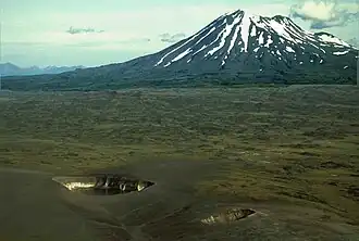 | Die beiden Maare (links das östliche Maar, rechts das kleinere westliche Maar) mit dem Vulkan Mount Peulik im Hintergrund | ||