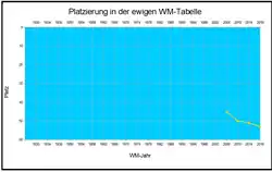 | 5 WM-Spiele 2 Siege 1[1] Unentschieden 2 Niederlagen 5:7 Tore | |