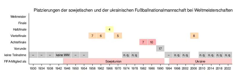 - ↑ Ukrainische Spieler in Schweden (1958), Chile (1962), England (1966), Mexiko (1971), Spanien (1982) und Italien (1990) als Teil der Mannschaft der UdSSR.