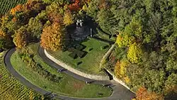 Das Denkmal ist in Bruchstein ausgeführt. Es gliedert sich in einen Zylinder mit kantigem Gesims und einen sich nach oben hin anschließenden kreuzförmigen Aufsatz, auf dessen Zentrum eine runde Metallschale liegt. Den Unterbau bildet eine kreisförmige Aussichtsplattform, ebenfalls mit kantigem Gesims. Die Wiese unterhalb des Denkmals ist mit Buchsbaum in Form des Eisernen Kreuzes bepflanzt.[3]