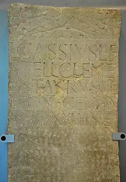 - ↑ AE 1968, 00404, CIL 13, 08713, CIL 13, 08715, CIL 13, 08732, CIL 13, 08733, CIL 13, 08734, CIL 13, 08735, CIL 13, 08736, AE 1977, 00542, AE 1979, 00415 und AE 1979, 00416, sowie CIL 13, 12214,05a, CIL 13, 12214,06, CIL 13, 12214,08a, CIL 13, 12214,09 bis CIL 13, 12214,11, CIL 13, 12214,15a, CIL 13, 12214,17, CIL 13, 12214,19 bis CIL 13, 12214,21, CIL 13, 12214,23b, CIL 13, 12214,26, CIL 13, 12214,28 und CIL 13, 12214,29