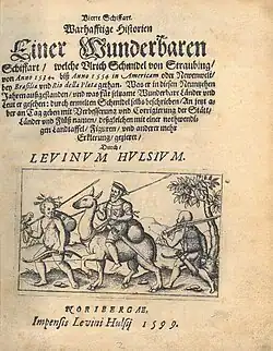 „Wahrhaftige Historien einer Wunderbaren Schiffart/welche Ulrich Schmidel von Straubing/von Anno 1534 biß Anno 1554 in Americam oder Neuenwelt, bey Brasilia und Rio della Plata gethan. Was er in diesen Neunzehen Jahren außgestanden/vund was für seltsame Wunderbare Länder und Leut er gesehen: durch was Schmidel selbst beschrieben An jetzt aber an Tag geben mit Verbesserung und Corrigierung der Stätt/Länder und Flüssnamen/desgleichen mit einer notizwendigen Landtaffel/Figuren/und anderer mehr Erklerung gezieret Durch Levinum Hulsium.“[10]