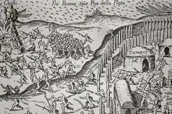 Mit seinen 400 Mann erreichte Juan de Ayolas nach einer Vierundachtzigmeilenreise – auf der wiederum 50 Soldaten verhungerten – nach zwei Monaten das Volk der Timbú. Auf sechzehnsitzigen Einbäumen von 80 Schuh Länge und drei Schuh Breite kamen ihnen die Indios unter Führung ihres Häuptlings Zcherawassu bis vier Meilen vor ihrer „Siedlung“ in friedlicher Absicht entgegen.