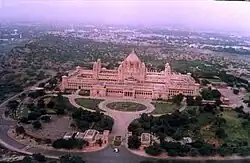 Als in der Mitte der 1920er Jahre eine Dürre die Region um Jodhpur heimsuchte, beschloss der Maharadscha – angeblich dem Rat seines Hofastrologen folgend – einen Palast zu errichten, um der hungernden Bevölkerung Arbeit zu verschaffen. Dafür konsultierte er den englischen Architekten Henry Vaughan Lanchester, der auch mehrere Bauten für den ehemaligen britischen König Eduard VII. entworfen hatte.