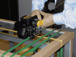 Um einen sog. Spanner und die vorher aufgebrachte Verschluss-Hülse wird das Umreifungsband um das Packgut gespannt. Die pneumatisch aufgebrachte Spannung wird gehalten, während der sog. Verschließer (Single- / Double-Notch) zum Einsatz kommt und die Verschluss-Hülse fest mit dem Umreifungsband verbindet.
