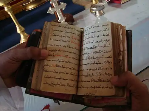Die Bibel in altsyrischer Schrift in der St. Georgs-Kathedrale in Thozhiyur, Kerala, Südindien