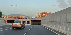 Der dicht bebaute Westen Tiranas im Stadtviertel Selita wird in einem Graben durchquert, so dass der städtische Verkehr einfacher die Autobahn auf Straßen- und Fußgängerbrücke queren kann.
