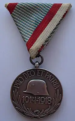 Die Auszeichnung ist eine aus Tombak gefertigte, versilberte runde Medaille mit einem Durchmesser von 31 mm und zeigt das von der Stephanskrone überragte kleine Wappenschild Ungarns. Umlaufend sind ein Eichen- (links) und ein Lorbeerzweig (rechts) mit kleinen Früchten zu sehen. Im Revers mittig die Jahreszahl 1914-1918 sowie im oberen Halbkreis die Inschrift PRO DEO ET PATRIA (Für Gott und Vaterland). Der untere Halbkreis wird von zwei zusammengebundenen Palmzweigen geziert.